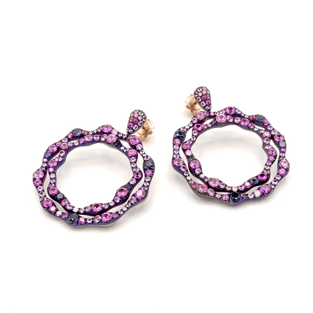 Earrings in 18k rose gold and titanium, white diamonds, pink sapphires and iolite