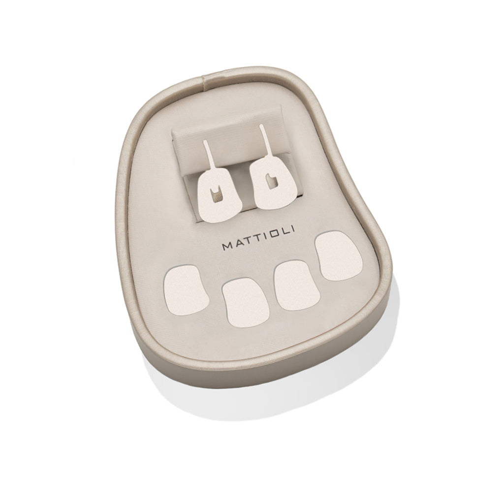 The Puzzle earrings with diamond pavé interchangeable parts are available in two sizes: small 15 x 18 mm and medium 22 x 27 mm. Both gift boxes also include two pairs of colorful interchangeable parts, chosen from over twenty colors of mother-of-pearl and gemstones, to always carry the highest degree of elegance and versatility.